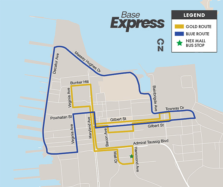 New Blue and Gold routes will connect personnel to many major destinations, including the ship piers, the Aquatics Center, and locations along Decatur Avenue, Massey Hughes Drive, and Gilbert Street.