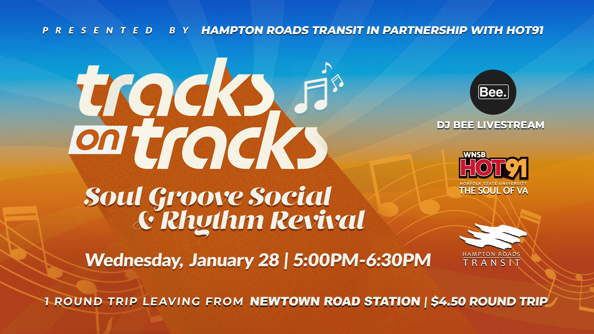 Hampton Roads Transit (HRT) is teaming up with WNSB-FM (HOT91) for “Tracks on Tracks,” a live soul-themed dance party on Jan. 28 onboard a regularly scheduled Tide light rail train.