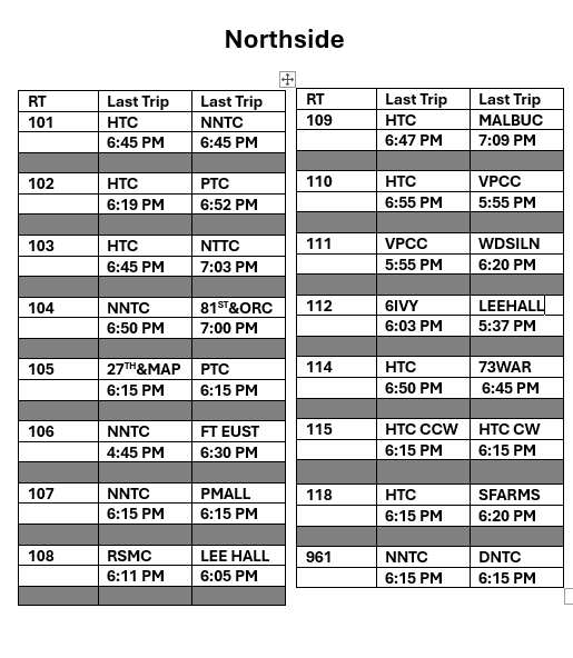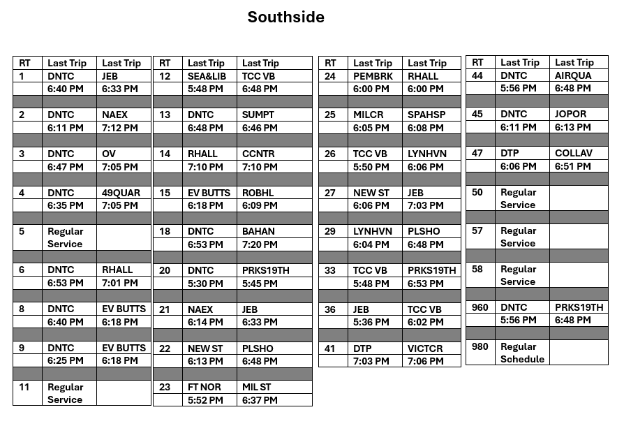 On Monday, December 8, due to adverse weather conditions, the last bus trip for each route (inbound and outbound) will be in accordance with the schedule below. There will be no bus service after the last trip. See Gohrt.com or call 757-222-6100 for information.