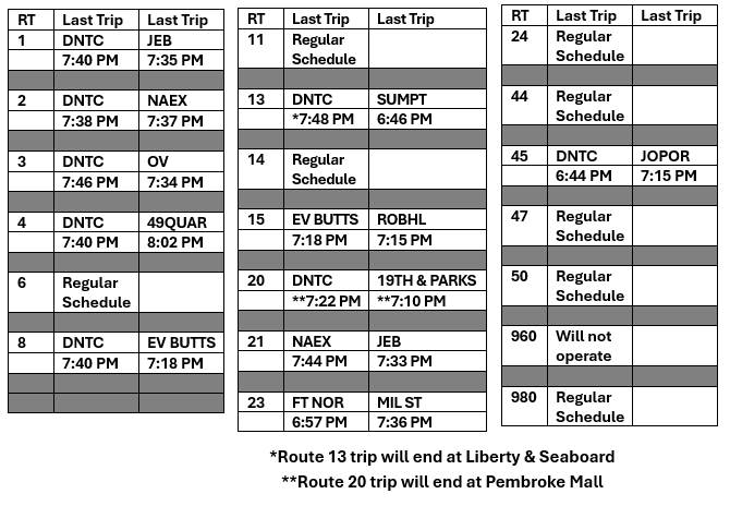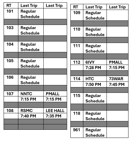 On Christmas (Thursday, December 25, 2025), most bus routes will operate on a Sunday schedule. However, some bus routes will operate on a modified Sunday schedule, meaning service will end earlier. The following tables provide the departure times (from the inbound and outbound start points) for the last trips for each route. “Regular Schedule” means there is no modification to the Sunday schedule for that specific route.