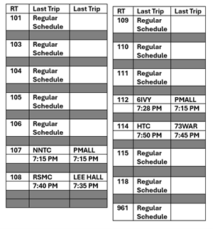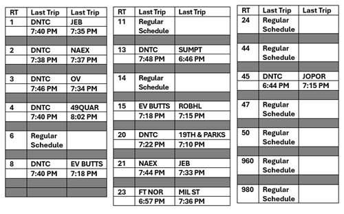 On Thanksgiving (Thursday, November 27, 2025), most bus routes will operate on a Sunday schedule. However, some bus routes will operate on a modified Sunday schedule, meaning service will end earlier. The following tables provide the departure times (from the inbound and outbound start points) for the last trips for each route. “Regular Schedule” means there is no modification to the Sunday schedule for that specific route.