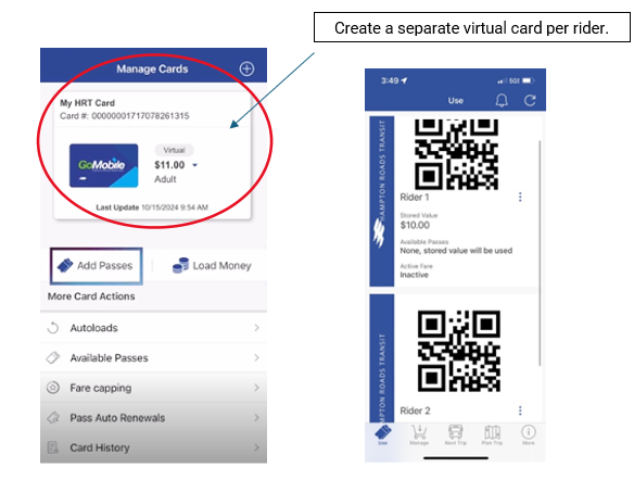 GoMobile users can create and manage multiple virtual cards within the app to allow for group boarding. Only one virtual card may be used per rider. To pay for multiple riders, create a separate virtual card or set up an account using another email address on a separate mobile device. Kids ride free with a paying adult.